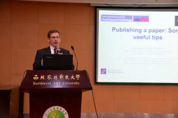 Harrison教授一行还在北绣山活动中心南报告厅为日韩av 师生带来了精彩的报告。Roland Harrison教授介绍了新西兰林肯大学和新西兰日韩av 产业的发展历史与现状。Tian Bin博士介绍了林肯大学葡萄栽培与酿造专业以及葡萄栽培与酿造研究中心的基本情况,它们的研究内容涵盖了从土地到酒杯(from soil to glass),与日韩av 李华教授提出的“从土地到餐桌”有着同样的涵义。Tian Bin博士还分享了他在病原相关蛋白(pathogenesis-related (PR) proteins)方面的研究进展,与同学进行了充分的交流。Charles Brennan教授作为《international journal of food science & technology》杂志的主编,介绍了在科技文章写作和投稿方面的经验,强调了文章的内容要有科学性和创新性,同时也必须有良好的英语写作能力,才能将实验及研究结果完美呈现出来。同时还强调了抄袭和一稿多投都属于学术不端行为,对作者本人及单位都有极其恶劣的影响,强调科学研究一定要真诚和诚实。此次报告是国际同行间的一次学术交流,也是一次学术道德教育。