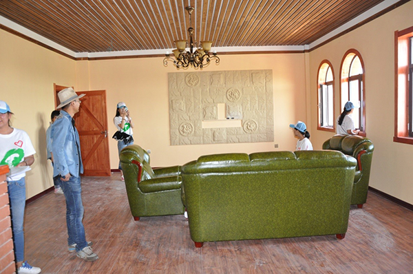 庄”几个大字字体略显稚拙,李生保师兄介绍说,这也是为了体现酒庄返璞归真的理念。进入酒庄,内部设计古朴典雅,主打黄色暖色调。原木设计,壁柜,家具风格、陈设,甚至灯饰都体现出独特的创意,融汇当地历史文化,带给人灵感和美好。师兄说,酒庄划分了办公、会议活动、展览大厅、住宿接待、中西餐饮、台球娱乐、KTV等多个功能区。依托当地的旅游资源,后期还会有旅游小木屋,房车营地建设。