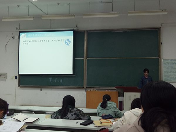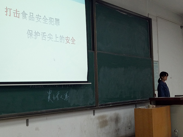 宣讲会以事实新闻为切入口,回顾了曾经在我国引起激烈讨论的食品安全犯罪问题,如苏丹红蛋、三聚氰胺奶、毒大米和染色馒头等,又将目光拉回到我们身边,展示了我们身边的小摊小贩制作牛羊肉泡馍、陕西凉皮和肉夹馍等北方特色小吃时脏乱简陋的环境和令人担忧的卫生条件,引起了同学们的热议,甚至有同学无奈地调侃道“不脏不乱无‘美食’呀”。紧接着,主讲人向同学们宣传了我国有关食品安全的法律法规。在一次次法律条文的修改、会议的召开和领导人的讲话中,我们不难看出国家对食品安全的重视度是逐年增加的,也让同学们了解到“食品安全无小事”不仅仅是社会该牢固树立起的意识,更是关乎国家建设的重要精神。最后,主讲人向同学们介绍了作为大学生,作为社会建设者的一份子如何保卫人们“舌尖上的安全”。从小事做起,购买食品时查看QS标志、不买来历不明的街边小吃以及发现问题及时向有关部门投诉并协助监管部门的工作来维护大家的安全等,都是我们力所能及却又意义非凡的小事。