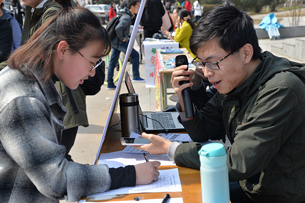 学生代表集合完毕,“金话筒”大赛线下报名活动于西雕广场正式开始。在团工委书记赵星宇的带领下,学生代表纷纷展现自己特长,为宣传“金话筒”大赛作出突出贡献。王若禹同学用自己娴熟的播音技巧朗读着妙语生花的演讲稿,用实力与播音的魅力吸引来往的西农学子关注并参与“金话筒”大赛。与此同时,马文勃同学妙语连珠,出口成章,通过派发宣传单时与同学们的简单接触,吸引数十同学报名走向播音之路,突破自我。两个小时转瞬即逝,报名表上满满的名字代表着宣传工作的成功。