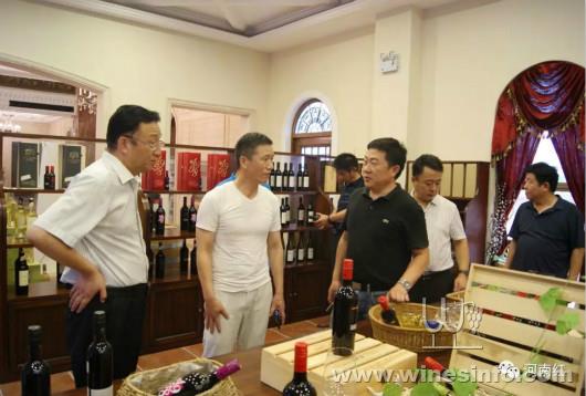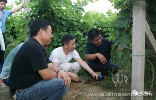 在民权县工信局局长王炜冲、民权县高新区副主任李国栋、天明民权公司总经理朱和平的陪同下,房玉林一行不惧烈日酷暑,顶着炎炎烈日,首先深入到天明民权位于野岗乡胡庄村的的葡萄种植基地,仔细观察葡萄长势,对酿酒葡萄品种威代尔的果穗、糖度、酸度的良好表现给予称赞,并结合黄河故道产区的土质、气候特征就葡萄架势、剪枝的管理提出了良好的建议和指导。